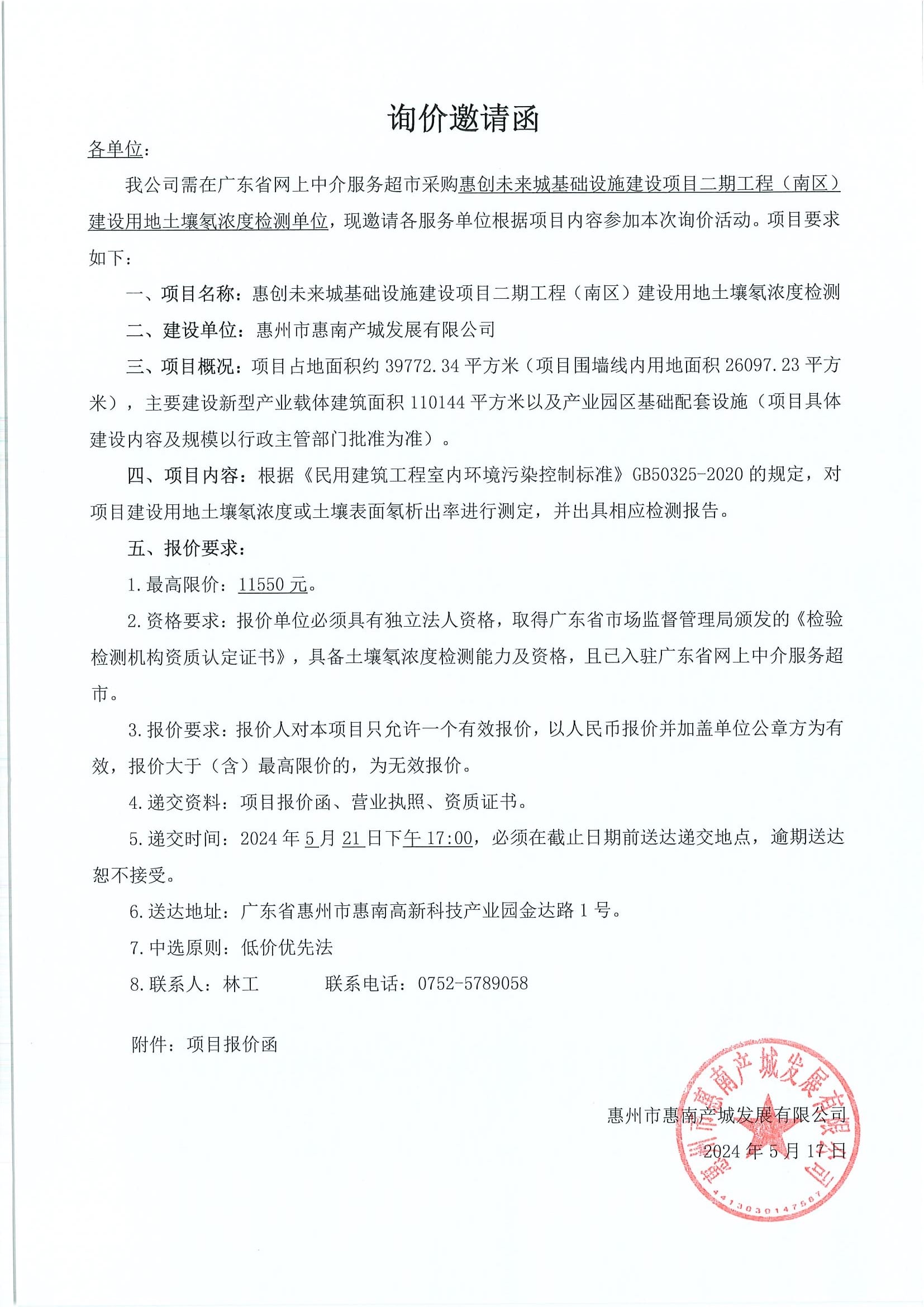 惠創(chuàng)未來(lái)城基礎(chǔ)設(shè)施建設(shè)項(xiàng)目二期工程(南區(qū))建設(shè)用地土壤氡濃度檢測(cè)服務(wù)詢價(jià)邀請(qǐng)函