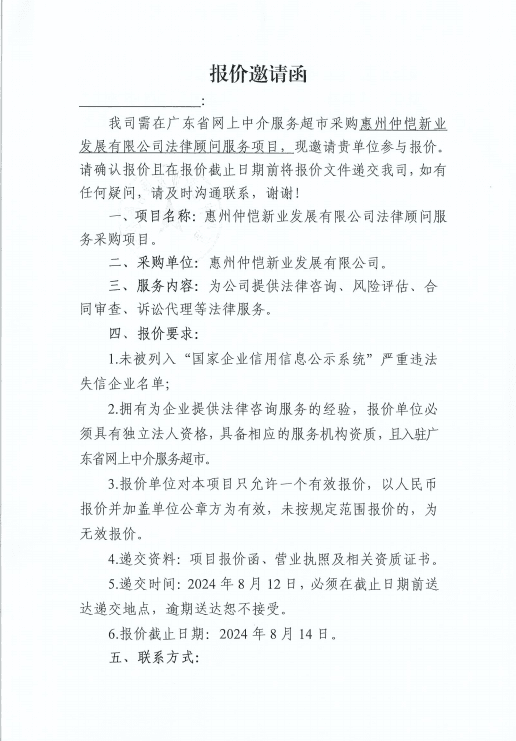 惠州仲愷新業(yè)發(fā)展有限公司法律顧問(wèn)服務(wù)項(xiàng)目
