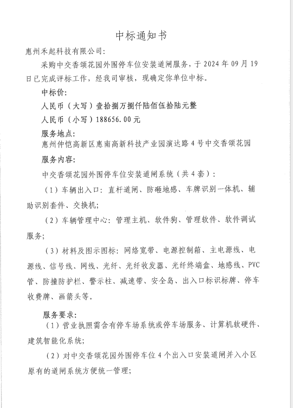 【中標(biāo)通知】采購(gòu)中交香頌花園外圍停車位安裝道閘服務(wù)