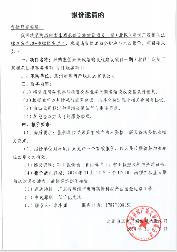 采購(gòu)惠創(chuàng)未來(lái)城基礎(chǔ)設(shè)施建設(shè)項(xiàng)目一期(北區(qū))定制廠房相關(guān)法律事務(wù)專項(xiàng)-法律服務(wù)項(xiàng)目