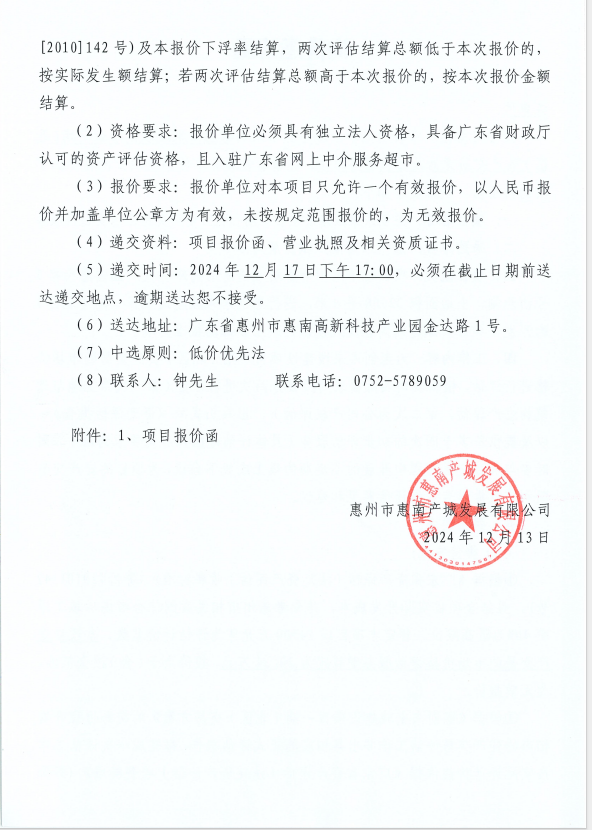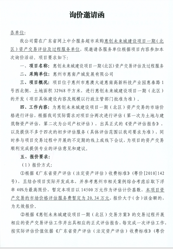 【詢價(jià)邀請(qǐng)函】惠州市惠南產(chǎn)城發(fā)展有限公司投資性房地產(chǎn)公允價(jià)值評(píng)估服務(wù)單位
