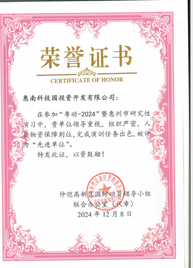 我司榮獲“粵動-2024”暨惠州市研究性演習(xí)的“先進單位”。