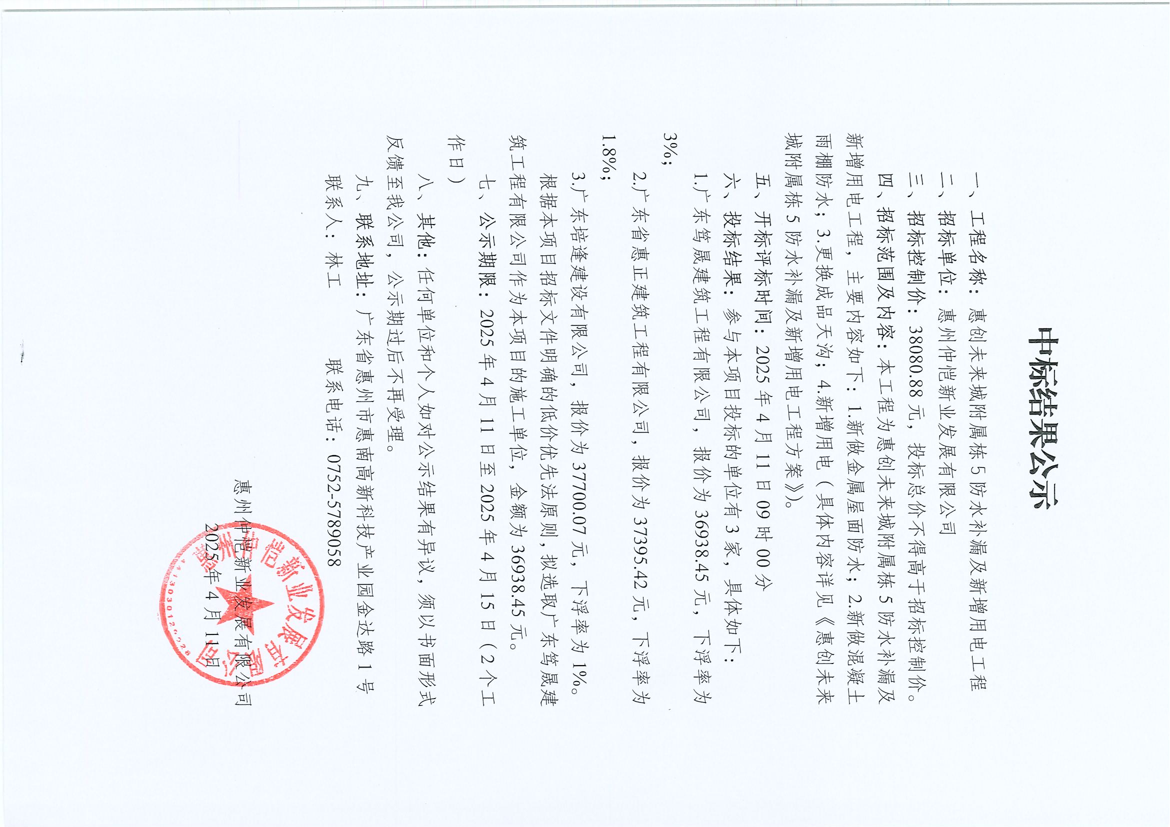 【中標(biāo)結(jié)果公示】惠創(chuàng)未來城附屬棟5防水補(bǔ)漏及新增用電工程