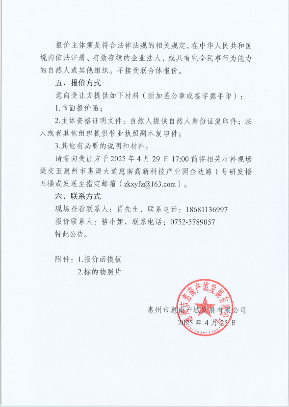 【招標公告】惠州市惠南產(chǎn)城發(fā)展有限公司 資產(chǎn)公開詢價及意向受讓方征集公告