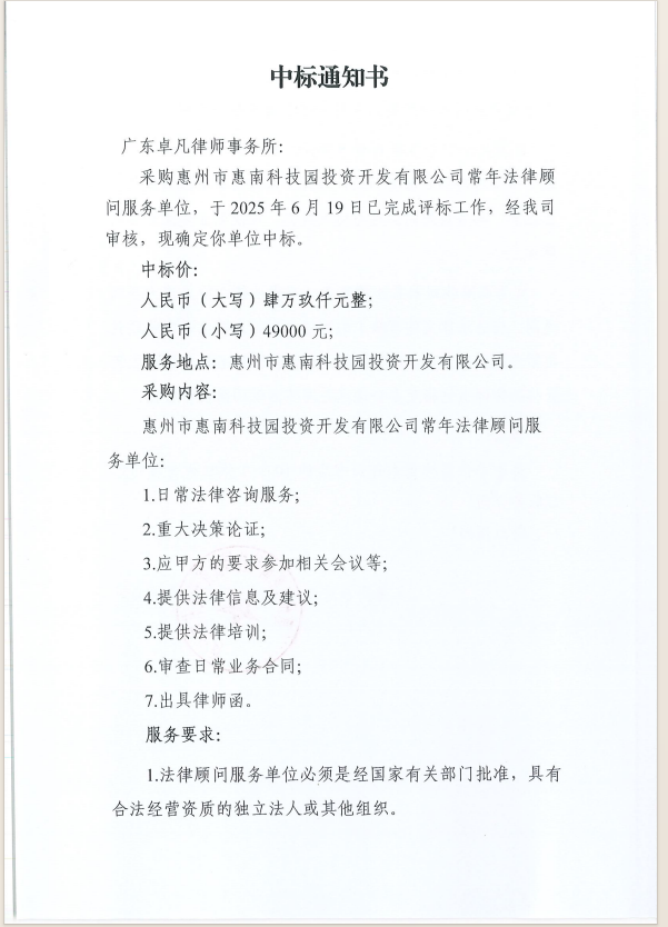 【中標通知】惠州市惠南科技園投資開發(fā)有限公司常年法律顧問服務(wù)單位(二次)
