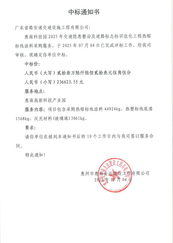 【中標(biāo)通知】惠南科技園2025年交通隱患整治及道路標(biāo)志標(biāo)識優(yōu)化工程熱熔標(biāo)線涂料采購服務(wù)