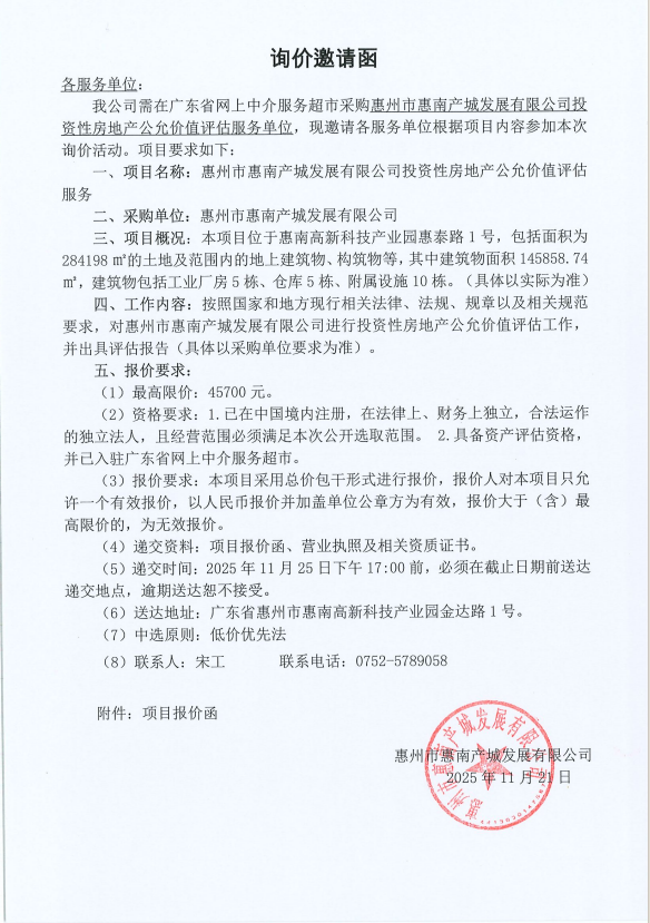 【詢價(jià)邀請(qǐng)函】惠州市惠南產(chǎn)城發(fā)展有限公司投資性房地產(chǎn)公允價(jià)值評(píng)估服務(wù)單位