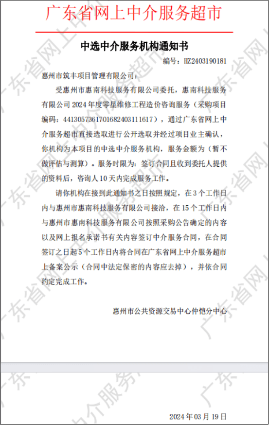 中選中介服務(wù)機(jī)構(gòu)通知書(惠南科技公司2024年度零星維修工程造價(jià)咨詢服務(wù))