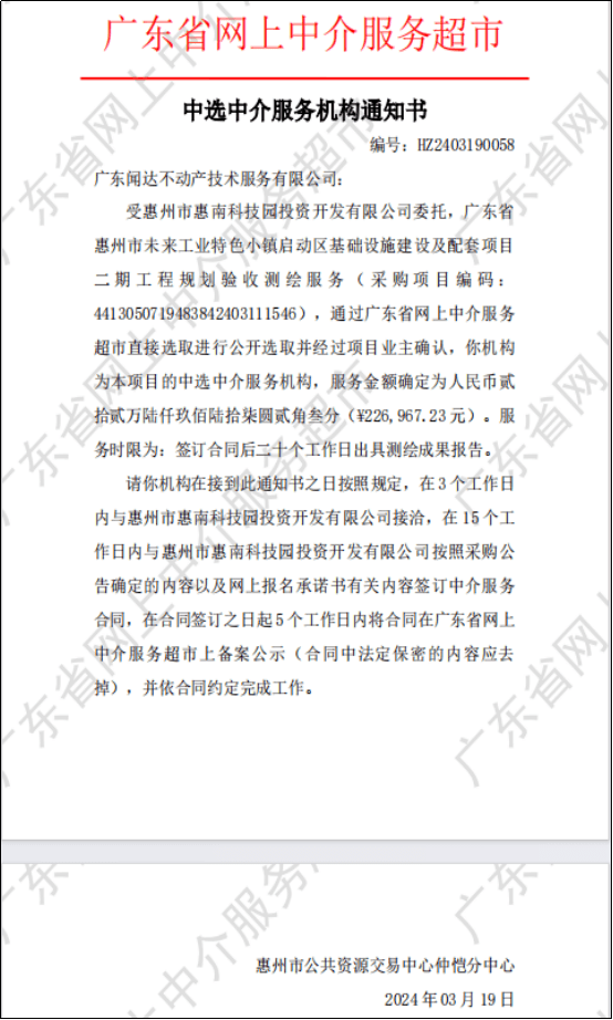 中選中介服務(wù)機(jī)構(gòu)通知書(廣東省惠州市未來工業(yè)特色小鎮(zhèn)啟動區(qū)基礎(chǔ)設(shè)施建設(shè)及配套項(xiàng)目二期工程規(guī)劃驗(yàn)收測繪服務(wù))
