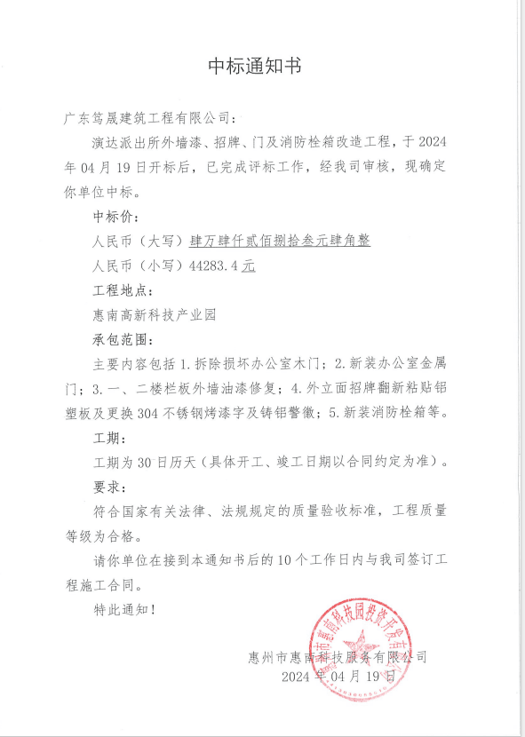 【中標通知】演達派出所外墻漆、招牌、門及消防栓箱改造工程