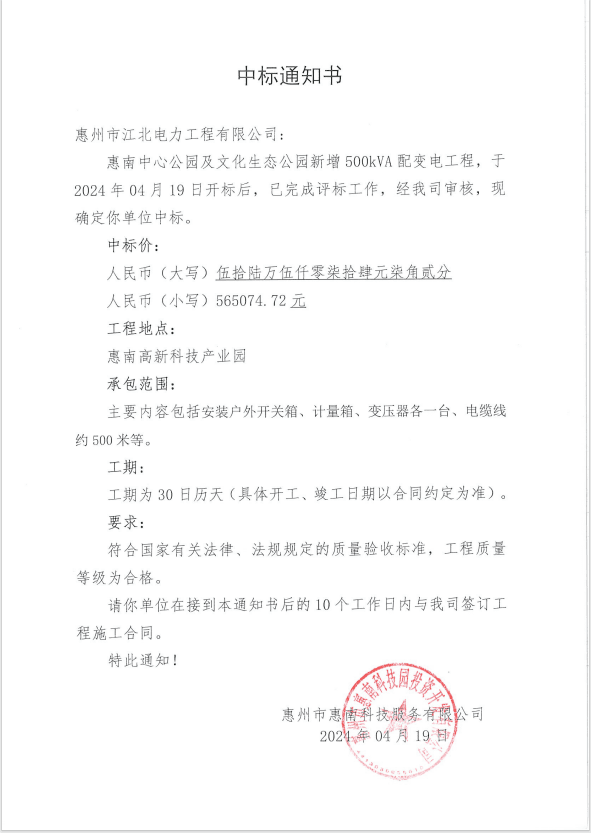 【中標通知】惠南中心公園及文化生態(tài)公園新增500kVA配變電工程