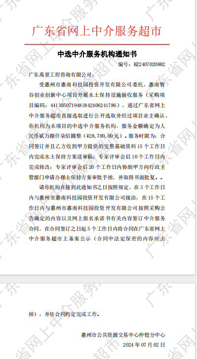 【中選通知】惠南智谷創(chuàng)業(yè)創(chuàng)新中心項目開展水土保持設施驗收服務
