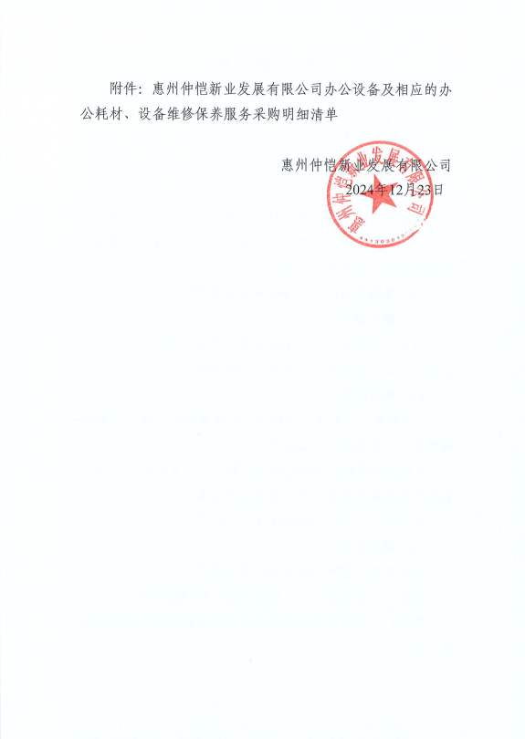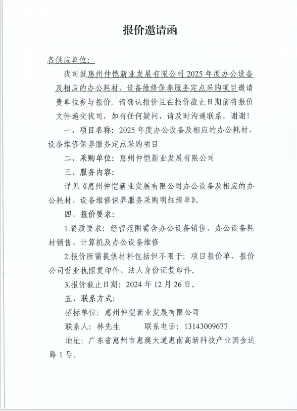 惠州仲愷新業(yè)發(fā)展有限公司2025年度辦公設(shè)備及相應(yīng)的辦公耗材、設(shè)備維修保養(yǎng)服務(wù)定點(diǎn)采購(gòu)邀請(qǐng)函