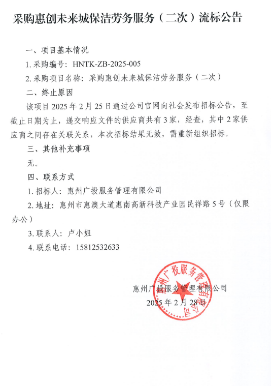 【招標公告】采購惠創(chuàng)未來城保潔勞務(wù)服務(wù)(二次)流標公告