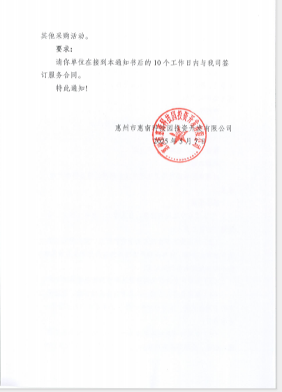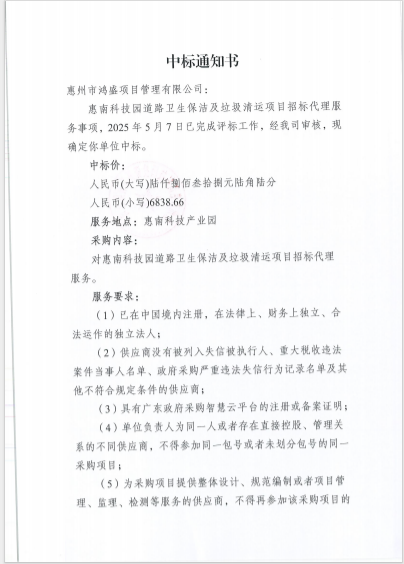 【中標(biāo)通知】惠南科技園道路衛(wèi)生保潔及垃圾清運項目招標(biāo)代理服務(wù)事項