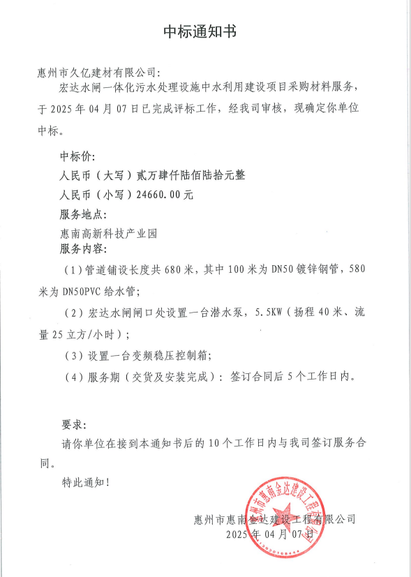 【中標(biāo)通知】宏達(dá)水閘一體化污水處理設(shè)施中水利用建設(shè)項目采購材料服務(wù)