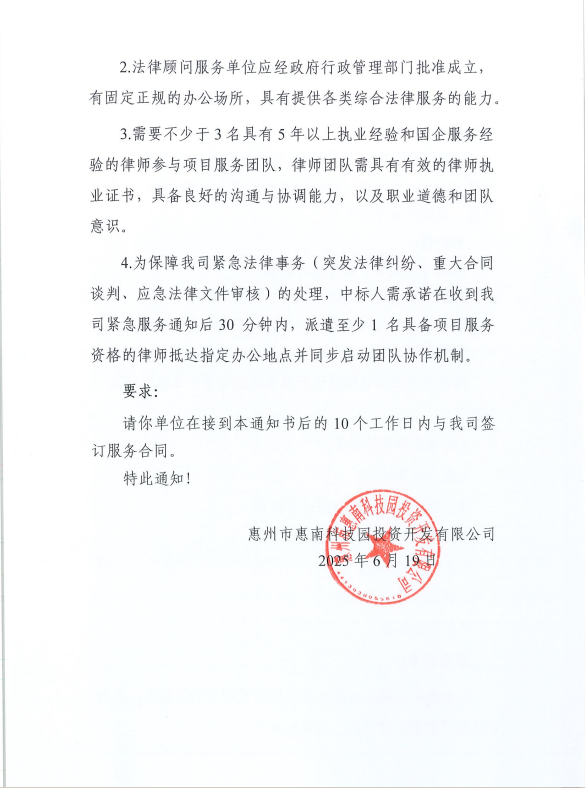 【中標通知】惠州市惠南科技園投資開發(fā)有限公司常年法律顧問服務(wù)單位(二次)