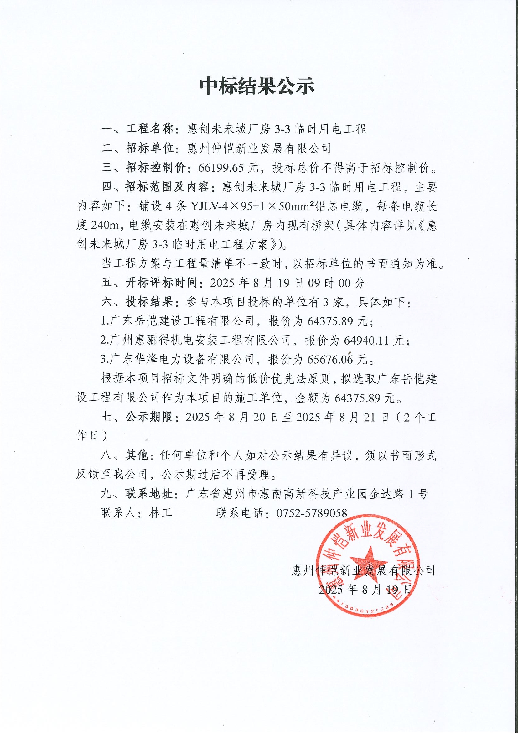 【中標(biāo)結(jié)果公示】惠創(chuàng)未來城廠房3-3臨時(shí)用電工程
