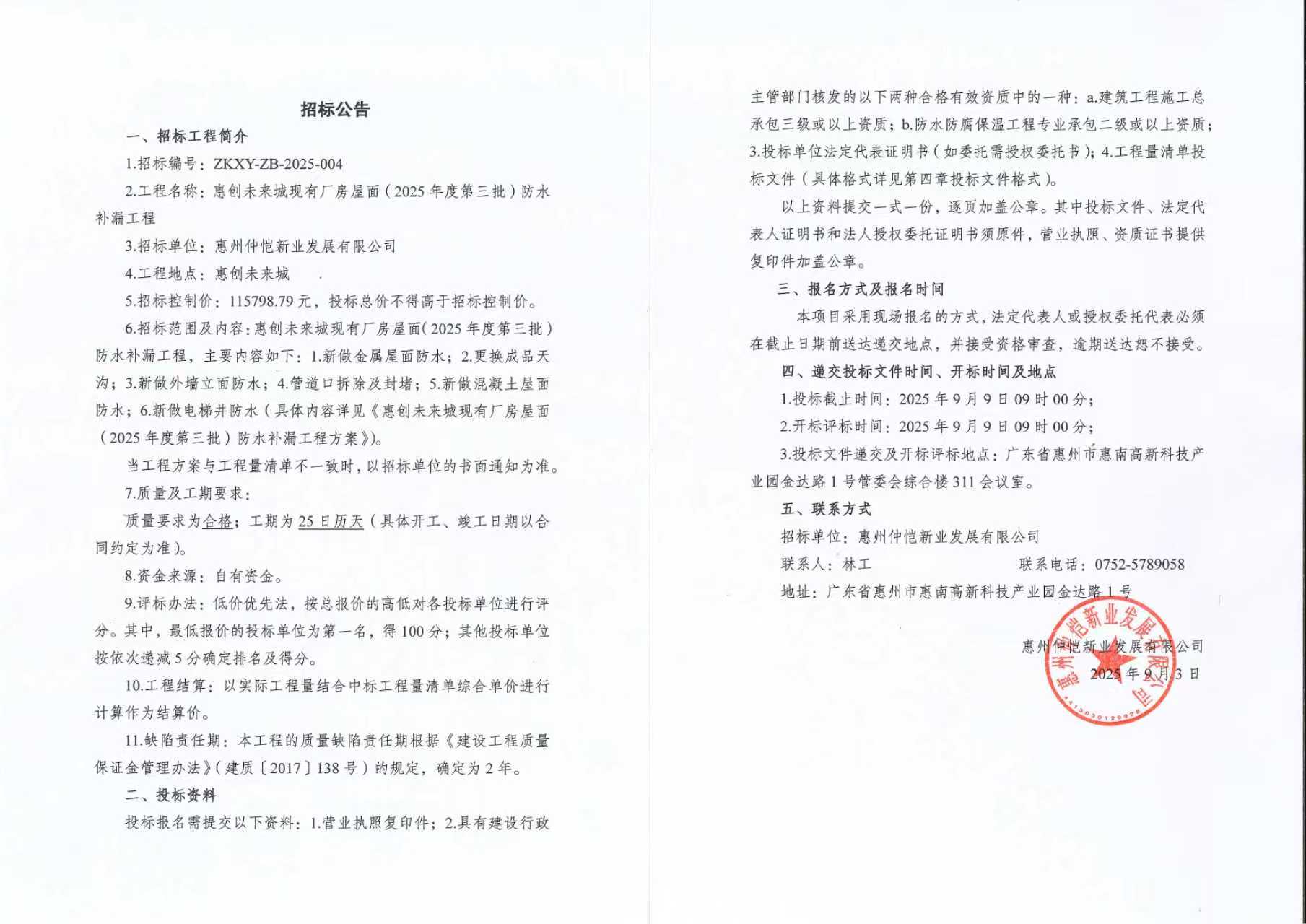 【招標公告】惠創(chuàng)未來城現(xiàn)有廠房屋面(2025年度第三批)防水補漏工程