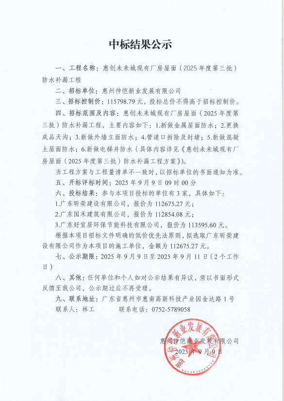 【中標(biāo)結(jié)果公示】惠創(chuàng)未來城現(xiàn)有廠房屋面(2025年度第三批)防水補(bǔ)漏工程